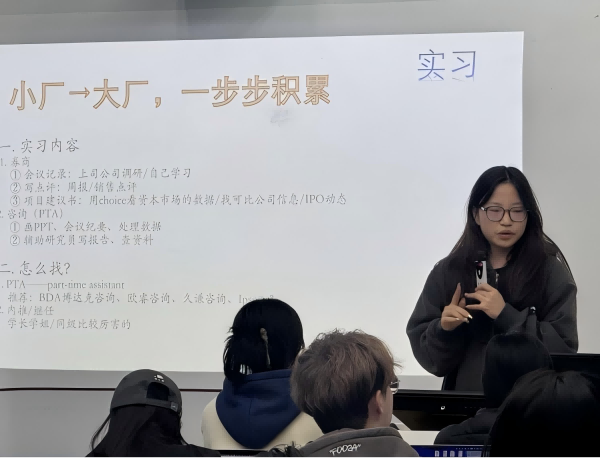 李丹妮同学凭借丰富的实习经历和优质offer,为同学们剖析了实习在职业探索中的重要作用,"实习不仅是技能练兵场,更是职业试衣间。"。李丹妮特别强调实习在职业探索中的关键作用她结合自身三段金融机构实习经历,深入剖析了实习对职业定位的塑造价值。她分享“三阶实习法”,建议低年级学生通过短期项目了解行业全貌,中年级学生聚焦目标岗位深度实践,高年级学生选择能沉淀资源的平台。她还系统介绍了简历制作、投递技巧及面试方法,提醒同学们在签订就业合同时注重条款细节,维护自身权益。