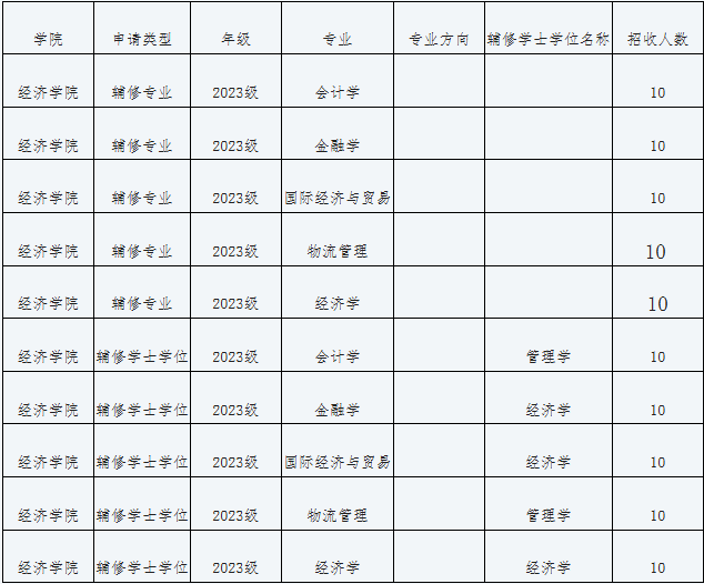 经济学院2023级辅修专业、辅修学士学位招生计划: