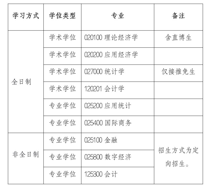 学院学科专业发展保持良好势头。拥有理论经济学一级博士点、一级硕士点,应用经济学一级硕士点,统计学一级硕士点和会计学二级硕士点;拥有会计硕士(MPAcc)、金融硕士(MF)、国际商务硕士(MIB)、应用统计硕士(MAS)及数字经济硕士(MDE)五个专业学位硕士点;拥有理论经济学博士后流动站,其中,理论经济学为广东省攀峰重点学科;政治经济学为省级重点扶持学科。现与香港岭南大学、澳门城市大学、诺丁汉大学等多所国内外著名高校商学院开展博士生联合培养项目。