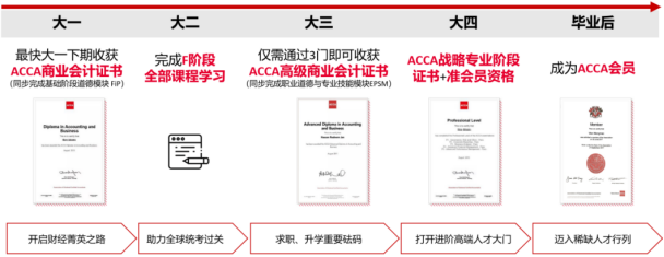会计学专业国际会计创新班(ACCA班)合理安排大学四年ACCA课程学习与考试进度,学生可稳步提升专业技能水平,收获全球名企、名校认可的ACCA各阶段执业资格证书,就业、升学更具优势。
