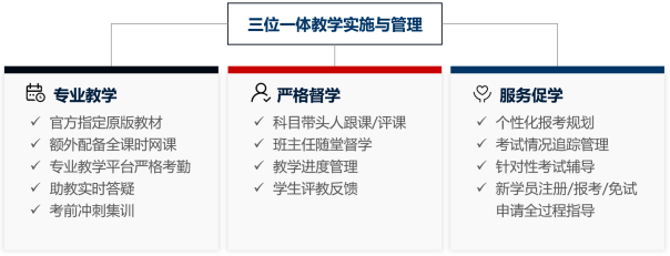 CFA&FRM授课老师均为具备名校学历背景、丰富名企从业经验和执教经验的CFA或FRM持证人。并设有专职班主任在 CFA与FRM 注册、考试报名、官方竞赛等各方面为学生提供全方位指导。“专业教学+严格督学+服务促学”三位一体实施教学与管理,带领学生高效学习备考,确保卓越教学成效。