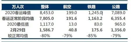 第1-5天,整体、航空、铁路、公路增速分别为3.1%、6.8%、24.8%、-0.6%;第6-10天,整体、航空、铁路、公路增速分别为2.1%、11.3%、16.1%、-0.5%。第11-15天,整体、航空、铁路、公路增速分别为0.8%,1.8%,10.5%,-2.6%。第 16-20天,整体、航空、铁路、公路分别为-68.5,-48.7%,-63.9%,-78.5%;第 21天,整体、航空、铁路、公路增速分别为-84.1% -70.2%、-77.6%、-85.4%。从春运第14天武汉“封城”开始,春运数据出现大幅下滑,这与全社会高度重视疫情防控,鼓励减少出门直接相关。