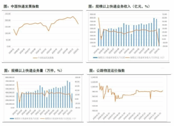 截止3月2日,全国铁路、道路、水路、民航共发送旅客1,607.7万人次,环比3月1日减少0.38%;其中,铁路发送旅客201.4万人次,环比增加4.35%,同比减少74.2%;道路发送旅客1,349万人次,环比增加0.15%;水路发送旅客18.55万人次,环比增加31.8%;民航发送旅客38.75万人次,环比减少35.16%,同比减少70.77%。全国高速公路网车流量2524.55万辆次,环比上升9.45%,同比下降3.01%。结合上述数据,我们估算迁出人口返城率为54.1%,日环比提高1.6个百分点。受新型冠状病毒肺炎疫情影响,国内运量整体下滑,客座率、货运等关键指标均下滑,铁路、公路受影响较大。随着近期复工推进,快递复工情况良好,疫情环境下,购物需求由线下向线上转移带动快递物流需求增加,叠加收费公路暂免通行费有望助力物流运输成本下降,渠道完善、业务来源稳定的物流头部企业有望从中受益。快递行业截至2月28日,全国邮政行业复工率达90.2%,快件日揽收量和投递量复产率分别达到81%和80%(数据来源:邮政局)。航空机场复工平稳推进,民航客流或迎来边际改善。航运港口业正密切关注海外疫情蔓延情况,出口货量或受海外疫情影响。铁路客运受需求冲击较大,货运虽受疫情影响较小但公路免费通行可能引起货物分流。公路方面,疫情防控期间免收通行费,拖累短期业绩。