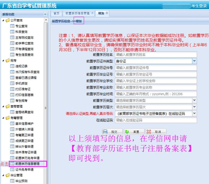 4、登录广东省自学考试管理系统,点击【前置学历信息管理】,点击【新增】,