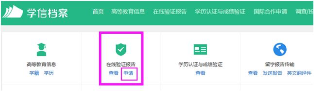 3、登录成功之后,点击申请在线验证报告,申请【教育部学历证书电子注册备案表】 注意:请选择“学历证书电子注册备案表”,不要选择“学籍在线验证”,