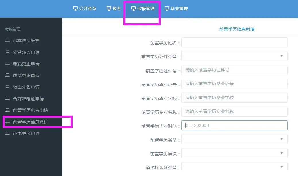 点击【考籍管理】--【前置学历信息登记】