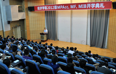 金秋九月,丹桂飘香。9月14日下午,经济学院2012级专业学位硕士研究生(MPAcc、MF、MIB)开学典礼在科技楼二楼报告厅隆重举行。深圳大学副校长阮双琛教授、研究生院杜龙书记、招生就业办主任姚凯教授、经济学院院领导班子全体成员,校内外导师30余人及全体新生参加了开学典礼。典礼由经济学院党委书记钟坚教授主持,经济学院院长陈勇教授致辞。